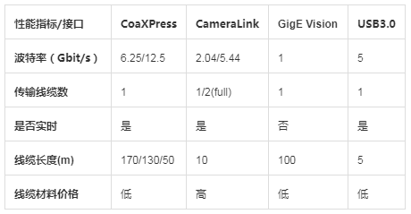 CoaXPress接口與其他幾種接口技術(shù)的比較列表: