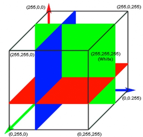 我們可以用一個(gè)立方體來(lái)表示RGB色彩模型,因?yàn)槲覀儎偛耪f了任意一種色彩都可以被拆分為R、G、B三個(gè)分量,同理,立方體中的任意一個(gè)點(diǎn)的位置坐標(biāo)也可以拆分為X、Y、Z三個(gè)分量,因此我們就可以利用立方體里面的某個(gè)點(diǎn)來(lái)表示某種顏色。