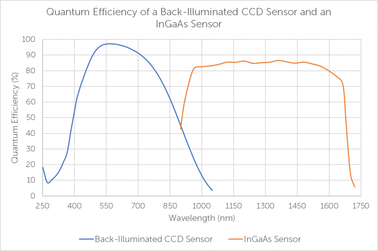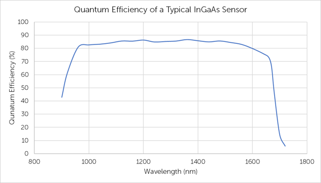 InGaAs傳感器的帶隙能量通常低于硅,這意味著它們能夠檢測(cè)更長(zhǎng)的波長(zhǎng),例如短波紅外(SWIR)區(qū)域(900-1700nm)。因此,InGaAs傳感器在950-1600nm區(qū)域內(nèi)的QE>80%。如圖顯示了典型InGaAs傳感器的QE曲線(xiàn)。